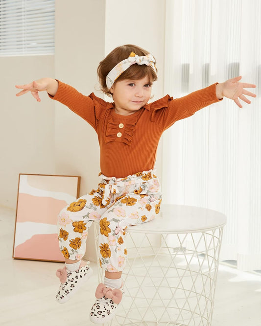 Adorable Toddler Girls' Ruffle Top & Floral Pants Outfit Set with Matching Headband