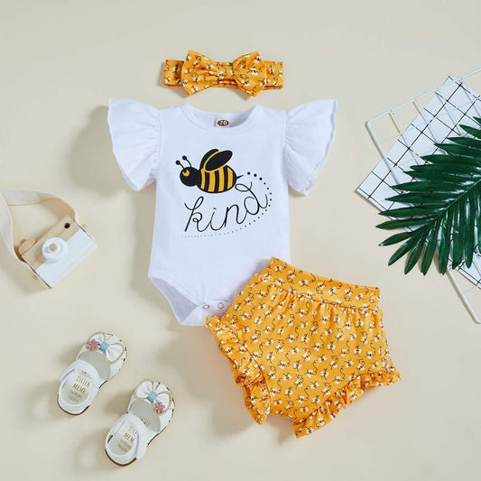 Adorable Newborn Baby Girl Floral 3-Piece Outfit Set - Short Sleeve Romper, Shorts & Matching Headband