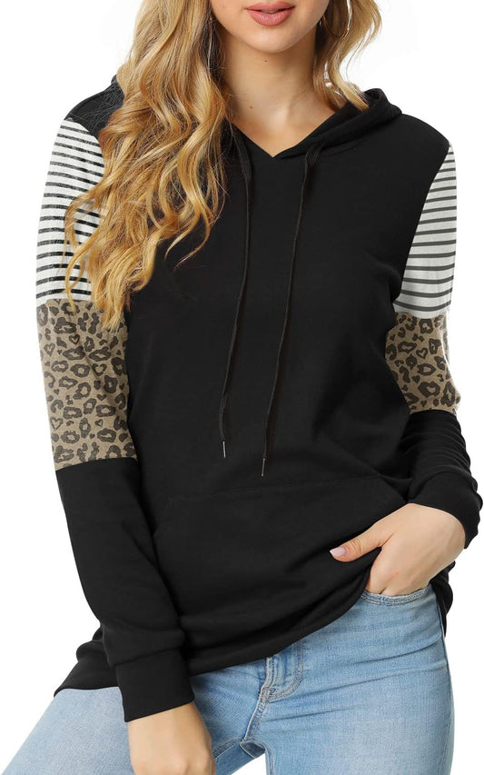 CATHY Women's Casual Color Block Hoodie Sweatshirt with Drawstring, Long Sleeves, and Pocket - Leopard Sleeve Design, Black, Size M
